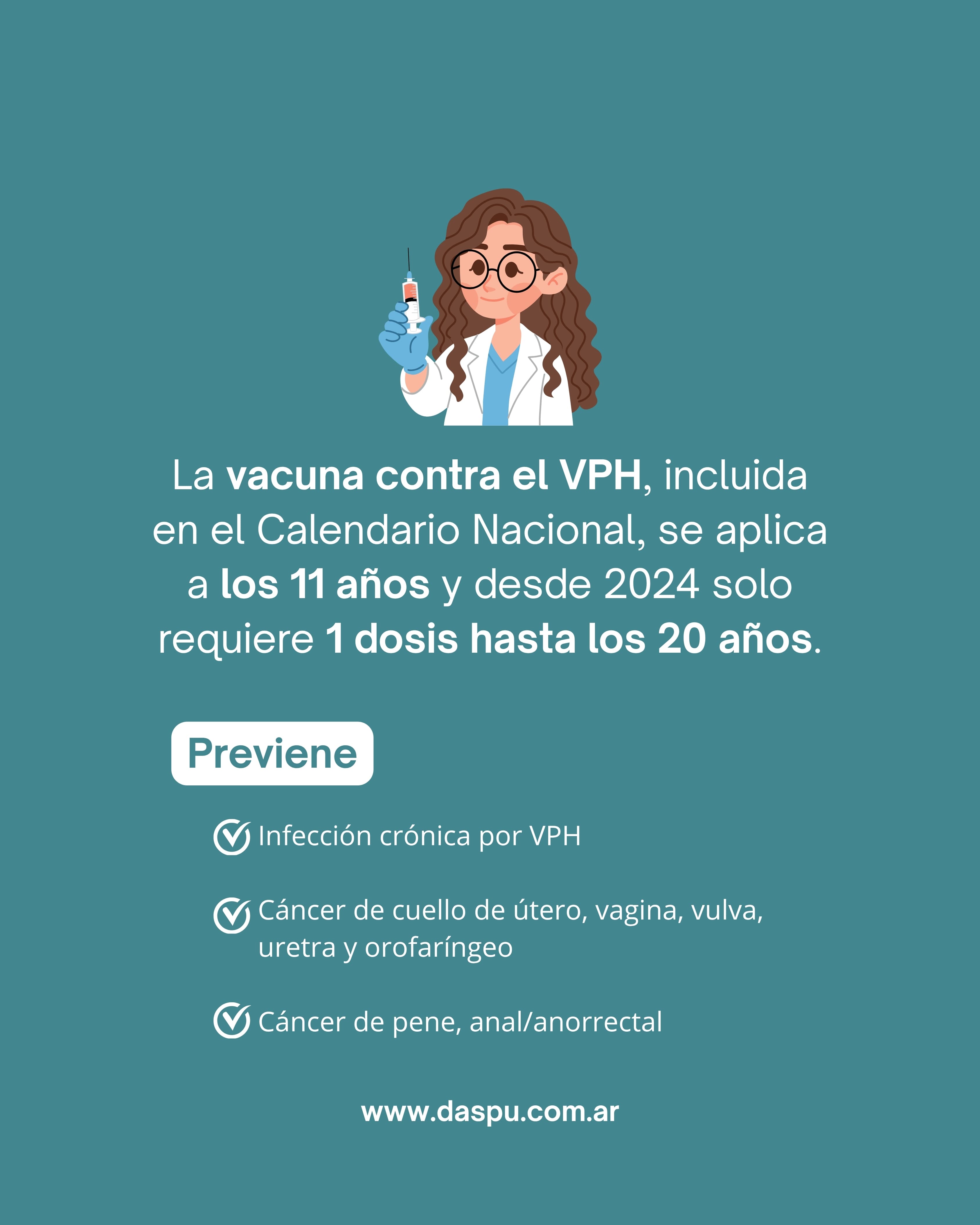 La vacunación es una herramienta clave de prevención. La vacuna contra el VPH está incluida en el Calendario Nacional de Vacunación y se aplica a los 11 años, tanto en niñas como en niños. Desde 2024, el esquema consiste en una sola dosis hasta los 20 años inclusive. Su aplicación permite prevenir la infección crónica por VPH y reducir significativamente el riesgo de cáncer de cuello de útero, así como también de vagina, vulva, pene, ano, uretra, región orofaríngea y colorrectal.